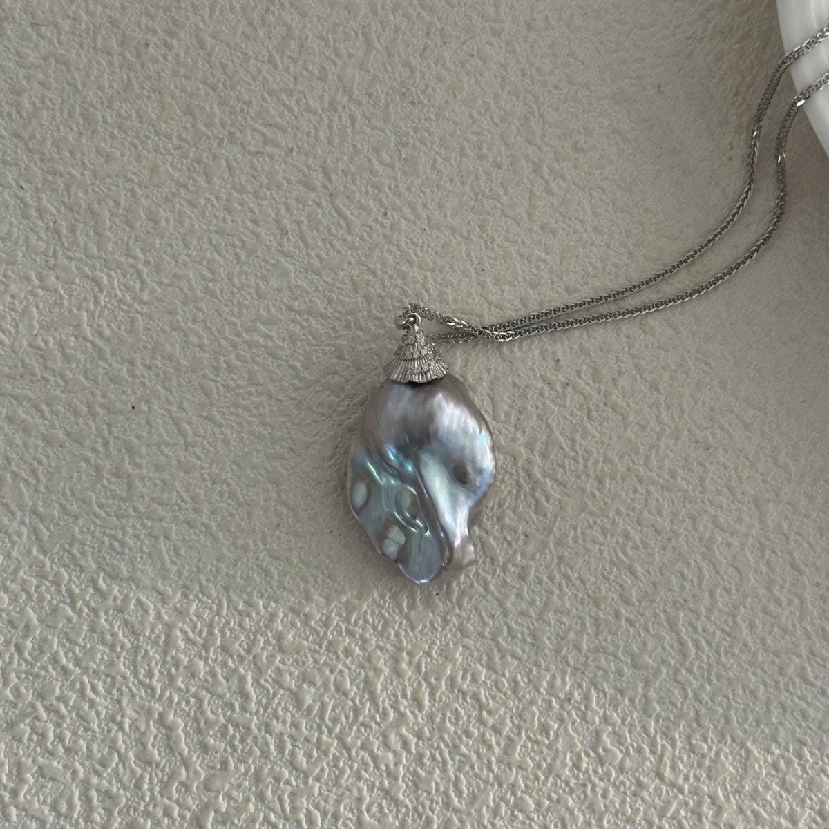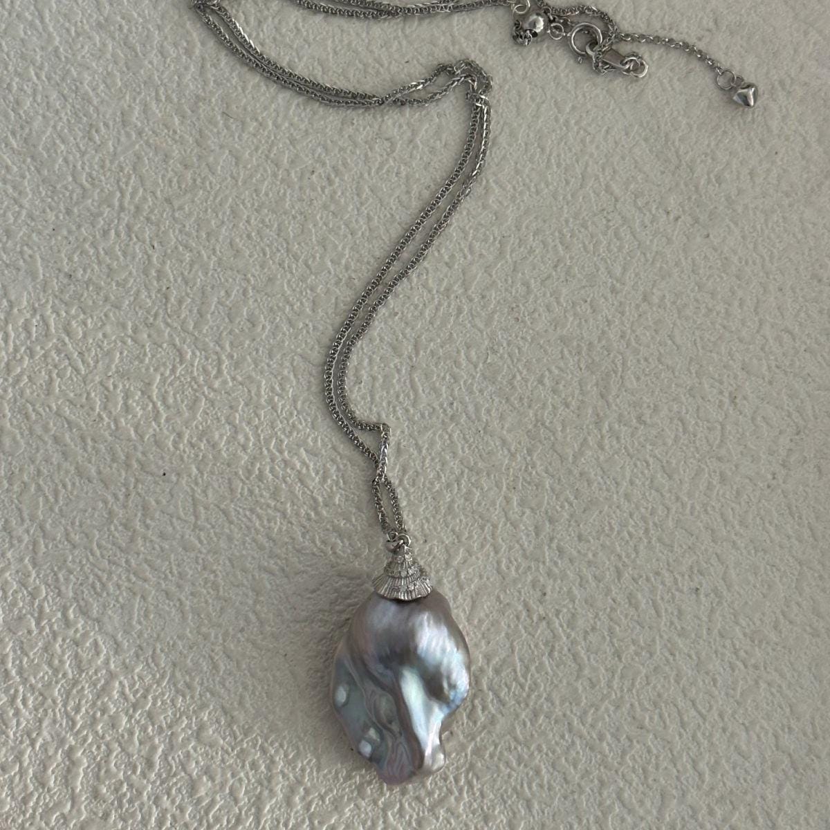 The cool, silvery tones of the rhodium-plated chain perfectly complement the iridescent depths of the baroque pearl, creating a sophisticated and modern aesthetic. Each pearl is organically shaped by nature, ensuring your pendant is a one-of-a-kind statement of raw beauty and contemporary elegance.