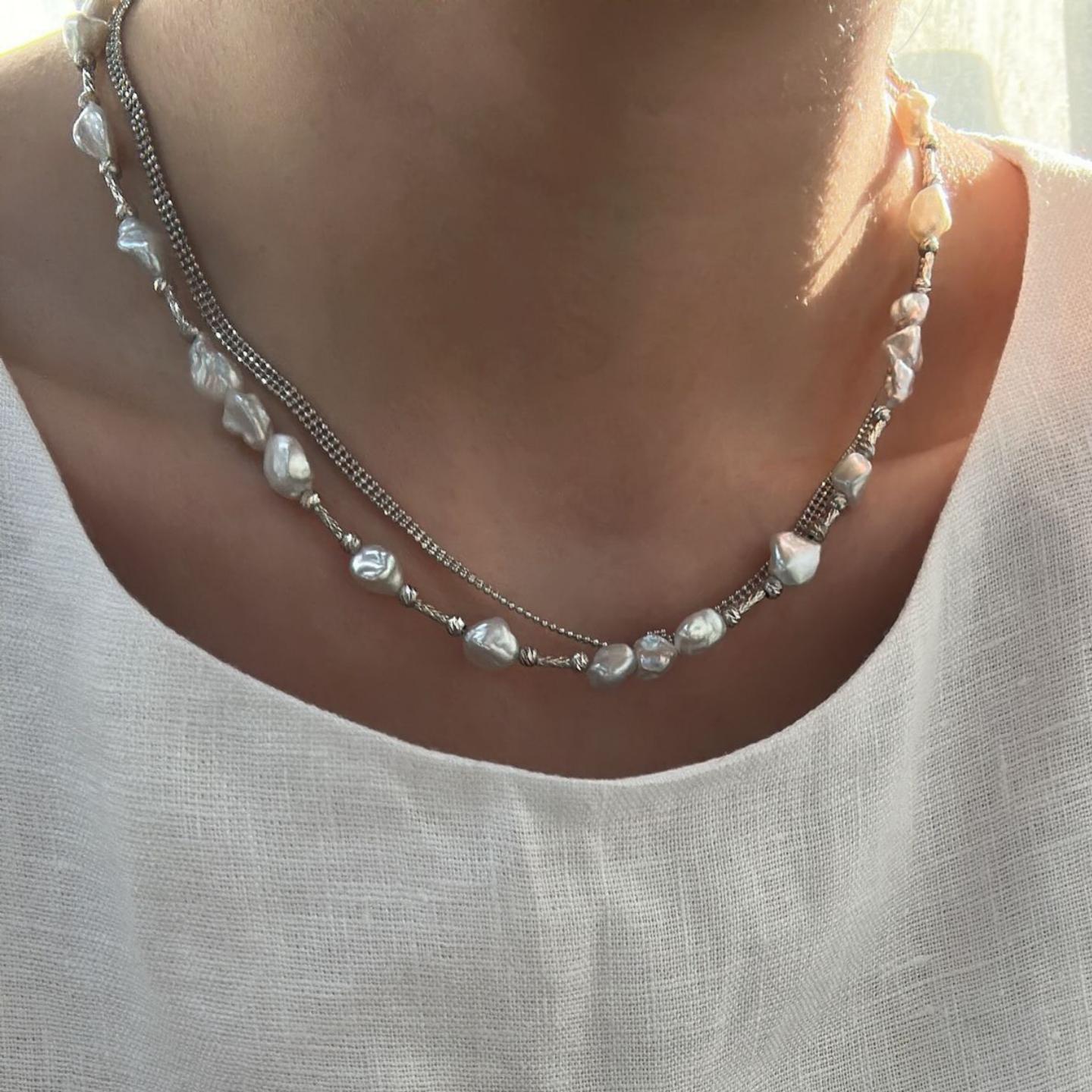The design celebrates the beauty of contrast: the cool, mirror-like glint of the irregular silver beans meets the soft, iridescent glow of the organic pearls. This "Mixed Media" approach creates a modern, sophisticated look that feels like a piece of wearable art. Whether you're dressing up a simple white tee or adding a unique touch to a formal ensemble, this necklace is designed to capture the light and the imagination.
